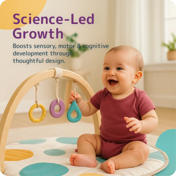 Yes, it includes a secure 3-point harness and a toy bar with bead rattles for sensory play