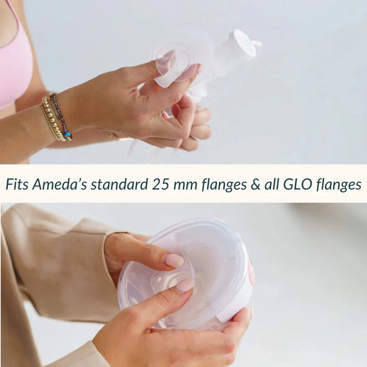 Soft silicone flange inserts (1 pair), compatible with Ameda standard 25mm Flange size. Provides a more snug fit for smaller nipple tunnel size, increasing comfort and reducing potential discomfort. Sold as a pair. Reusable, non‑sterile, BPA/DEHP‑free.