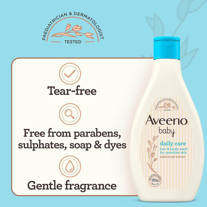 Aveeno Baby Daily Care Hair & Body Wash 250ml is a practical and gentle cleansing solution suitable to offer daily care to your baby from day one. In fact, this product suits both the hair and the body. Featuring a natural Oat extract, this cleanser gently cleans the baby’s hair and body, preserving not only the baby's skin protective barrier but also the microbiome. At the same time, it locks in moisture, softening and hydrating the skin while leaving the hair shiny and easy to comb. Furthermore, Aveeno Baby Daily Care Hair & Body Wash 250ml is Paediatrician tested and tear-free, with a gentle fragrance and a balanced pH. As a last note, the new bottle contains 50% of recycled plastic and is completely recyclable. In conclusion, this cleanser is gentle to your baby's delicate skin and immediately brings relief and nourishment.