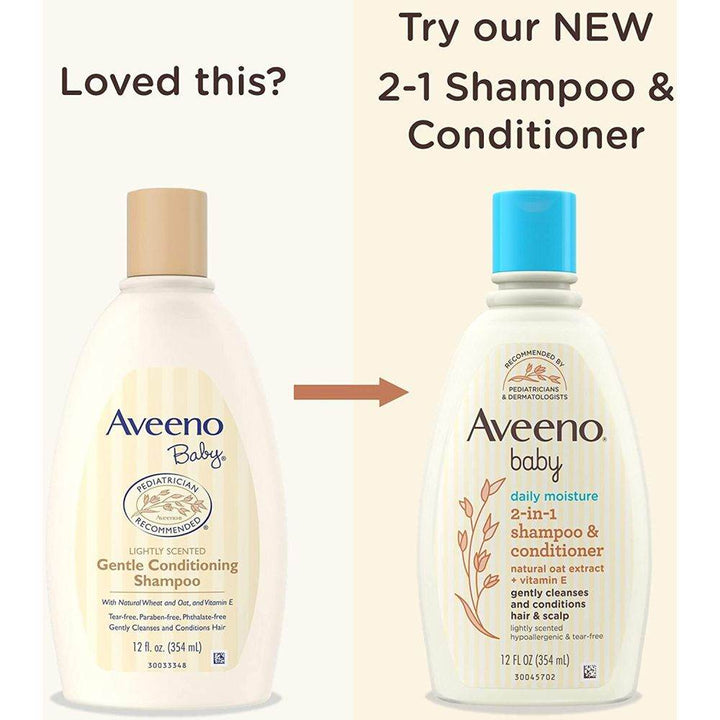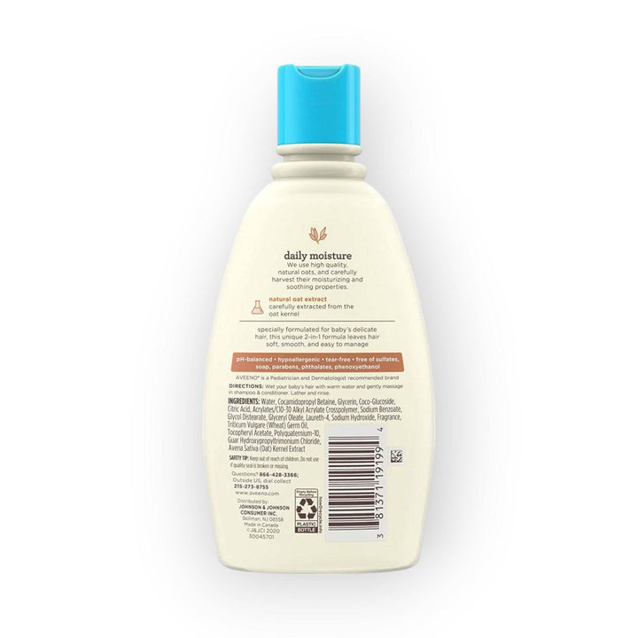 12-Fluid ounces of Aveeno Baby 2-in-1 daily Moisture tear-free baby shampoo and conditioner with natural oat extract to gently cleanse and condition hair and scalpThis nourishing shampoo and conditioner is specially formulated for baby's delicate hair and the unique 2-in-1 formula leaves hair clean, soft, smooth and easy to manageGentle enough for daily use on baby's delicate skin and hair, This hypoallergenic tear free shampoo and conditioner is balanced and free from Sulfates, parabens, soap, phthalates and phenoxyethanolFormulated with Vitamin E and natural oat extract carefully extracted from the oat Kernel. We use high quality, natural Oats and carefully Harvest their moisturizing and soothing properties.This lightly scented moisturizing shampoo and conditioner comes from Aveeno, a pediatrician and Dermatologist brand that offers hair and skin care products for baby