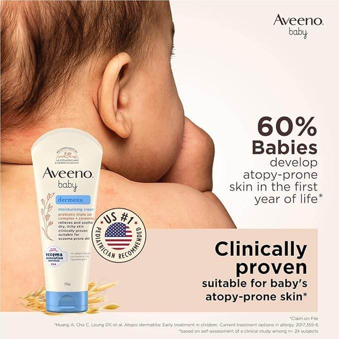 Aveeno Baby Dermexa Cream contains patented triple oat formula and ceramides. It works to soothe dry, itchy skin and is clinically proven to be suitable for eczema-prone or atopy-prone skin. Key Benefits: Aveeno Baby Dermexa Moisturizing Cream temporarily protects & helps relieve dry, itchy skin. Provides moisturisation for 24 hours. Directions for Use: Twist off cap, remove quality seal. Apply 2 times daily or as required. Do not use if the quality seal is broken. Safety Information: For external use only.