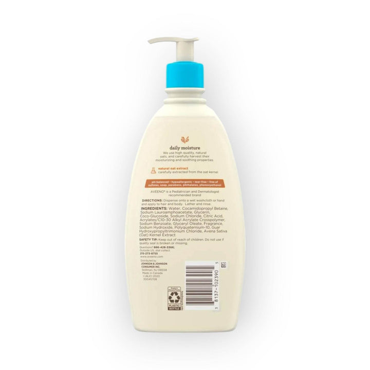 Gently cleanse your baby's skin and hair with Aveeno Baby Daily Moisture 2-in-1 Bath Wash & Shampoo, which features a nourishing formula that gently cleanses without drying. For babies with sensitive skin, this tear-free formula is safe for use on baby's delicate skin and hair. From a pediatrician-recommended brand, the baby body wash and shampoo formula contains natural oat extract, which is known to soothe and gently nourish delicate skin. The rich lathering formula rinses clean, leaving a light, fresh fragrance. This hypoallergenic baby wash and shampoo is free from soap, parabens, sulfates, phenoxyethanol and phthalates and can be used every day to help keep your baby's skin and hair soft and smooth.