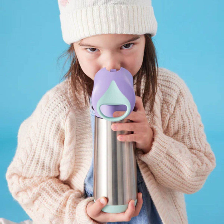 Take all day hydration to the next level with our new 500ml insulated drink bottle. Insulating super powers indeed! The double walled stainless steel in our larger bottle size will help keep liquids cool for up to 15 hours and warm for up to 8 hours. The front press button opening can be used with one hand to help with those big schoolyard thirsts and the integrated carry handle means it's always on hand. The easy drink silicone straw offers free flow drinking and once done, click the lid back in place for leak free schoolbags.