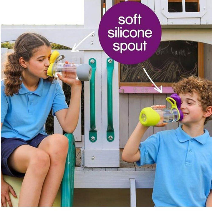 Its silicone spout requires no compression, just a light sucking action and features a slight valve to prevent spills. Large push button and flip top lid makes it easy for kids to open and drink from.