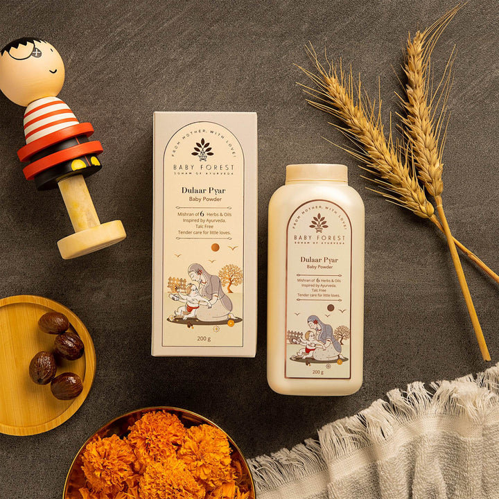 Baby Forest Dulaar Pyar talc-free baby powder is a mishran of 6 herbs & oils inspired by Ayurveda. The naturally aromatic and cooling baby talc-free powder creates a layer of protection for the baby's delicate skin.