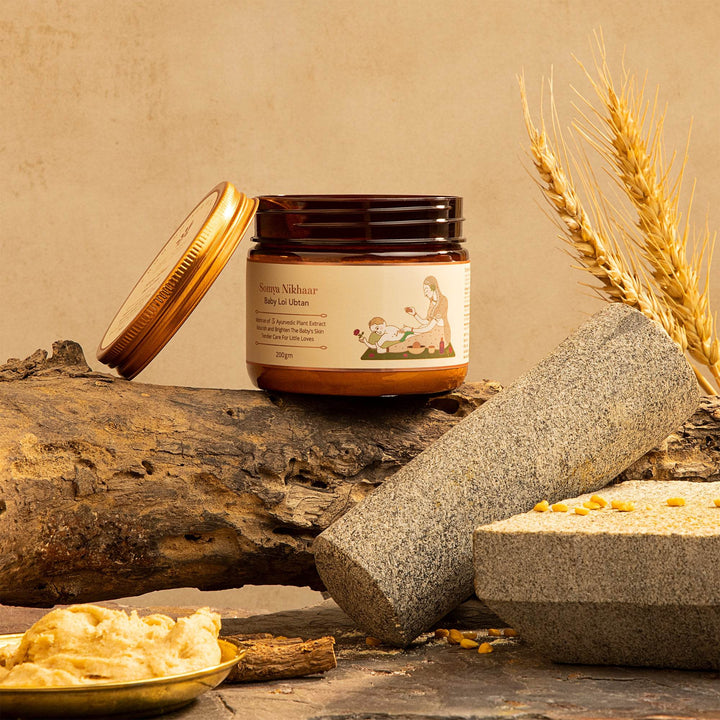 A luxurious infusion of 5 natural ingredients inspired by Ayurveda, the Somya Nikhaar Baby Loi Ubtan gently removes the baby's extra hair from the baby's skin. It is enriched with the nourishment of wheat flour, turmeric, besan, licorice, and vetiver and gently cleans and enhances the baby's skin according to your little one's natural glow.