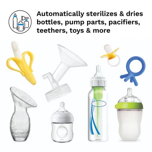 The Baby Brezza One Step Sterilizer Dryer automatically sterilizes and dries baby bottles, pump parts and accessories from any brand in one easy step - Now available in sleek Charcoal color. Uses natural steam to kill 99.9% of harmful bacteria, mold & the yeast that causes thrush in just 8 minutes, then automatically dries with hot air. Products stay sterilized inside for up to 48 hours (24 hours longer than other electric sterilizers). This deluxe machine has a large universal capacity, holding 6 bottles, breast pump parts, pacifiers, teethers, sippy cups and other accessories from any brand, all in one cycle. This premium sterilizer dryer is compatible with plastic, silicone and glass baby bottles, pacifiers, teethers, binkys, sippy cups and more. Use the digital LCD control panel to choose from 7 settings, including 4 modes (Sterilizer & Dryer, Sterilizer Only, Dryer Only, or Sterile Storage Rack) and 3 dryer cycles (30 min Rapid Dry, 45 min Normal Dry & 60 min Extra Dry). Features modern design that will look great on your counter and Auto-Shut-Off. Faster, safer and more hygienic than traditional sterilizing methods like boiling water, microwave bags, UV sanitizers and dishwashers, while also using less water. 1 year limited warranty (not valid if shipped or used outside the US).