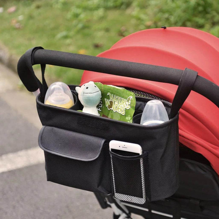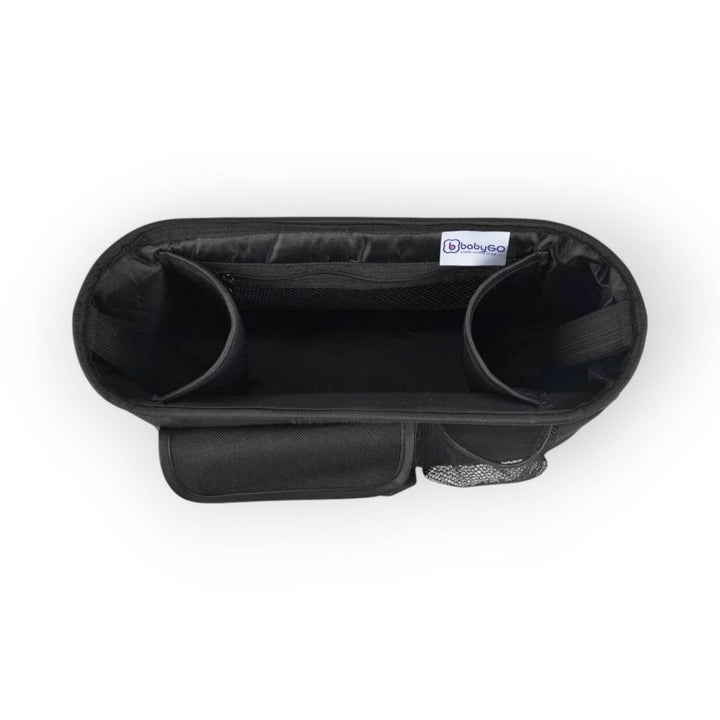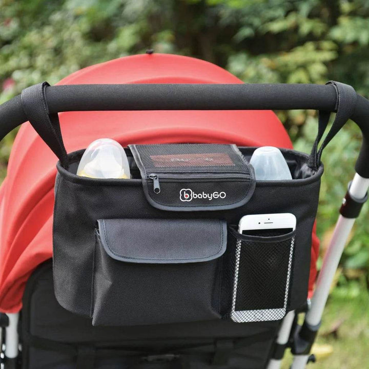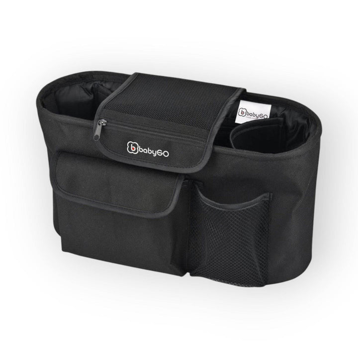 Anyone who travels with a baby knows what they always need to have with them and at hand. With the babyGO Stroller Organizer, you always have the essential equipment for your baby with you. The organizer can be easily attached to the handlebar of the stroller with two straps and has compartments for baby bottles, thermos flasks, wet wipes, diapers, baby food, keys, cell phone, or your coffee to go.