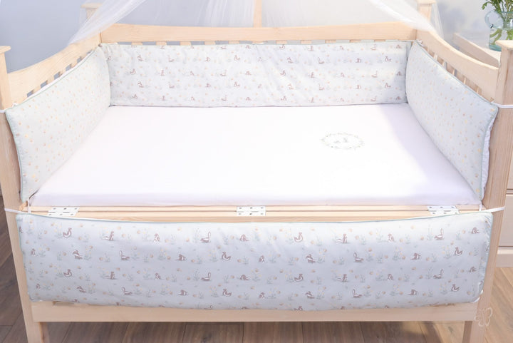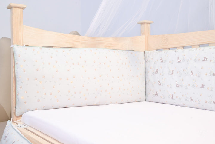 At Blooms and Butterflies, coziness is our design philosophy. Our Be Busy four piece Bumper Cover Set is made from 100% soft, breathable cotton material, providing a perfectly comfortable surface for your baby. Designed to fit most cots; secure the ties to the four sides of the cot and regularly check that they are tied in place for babys safety.