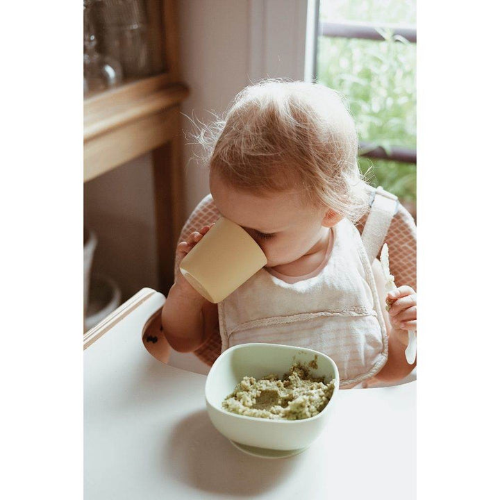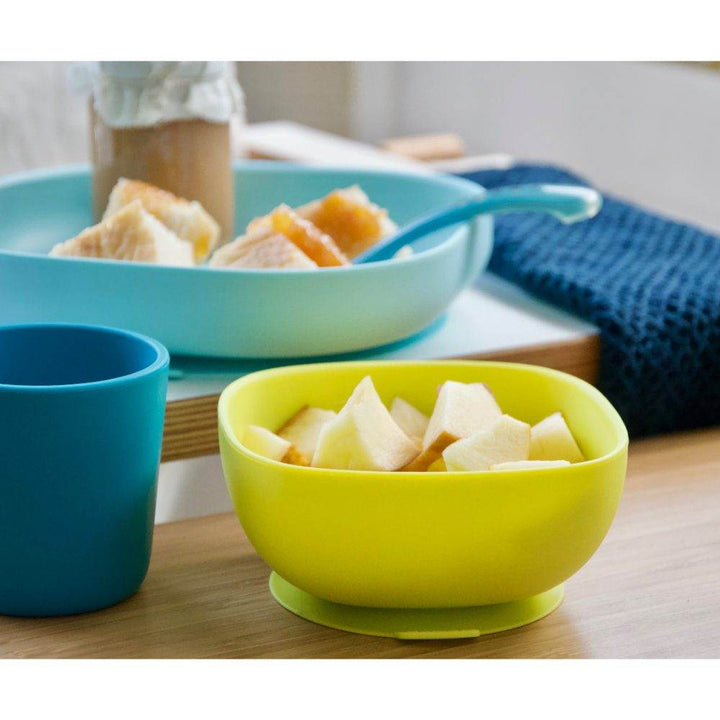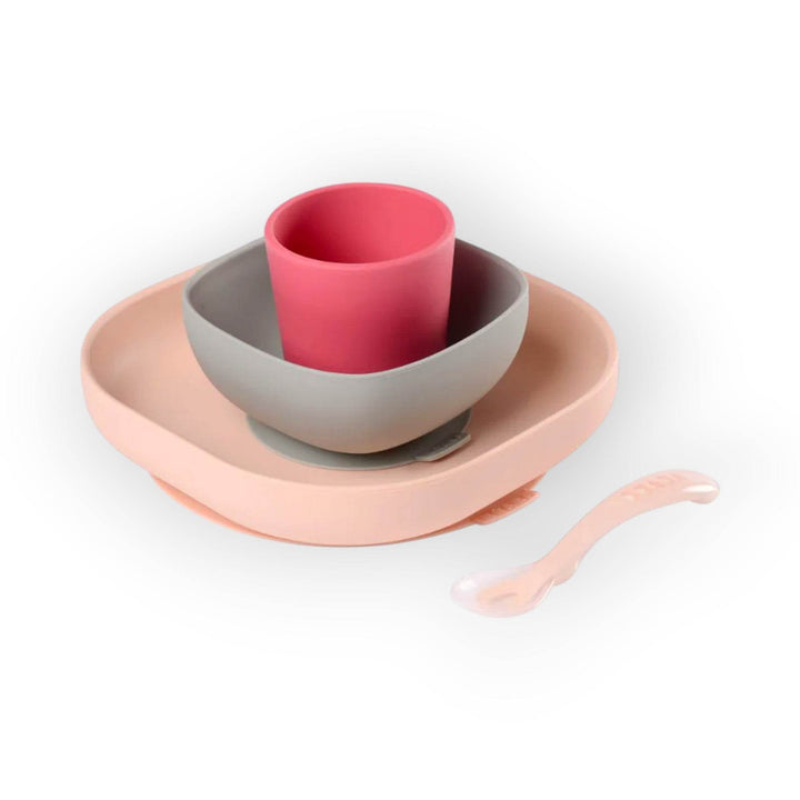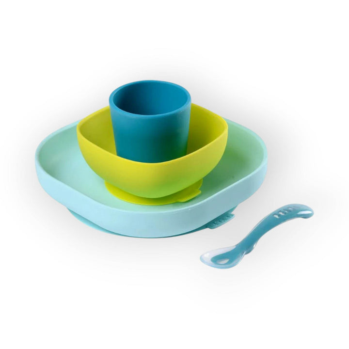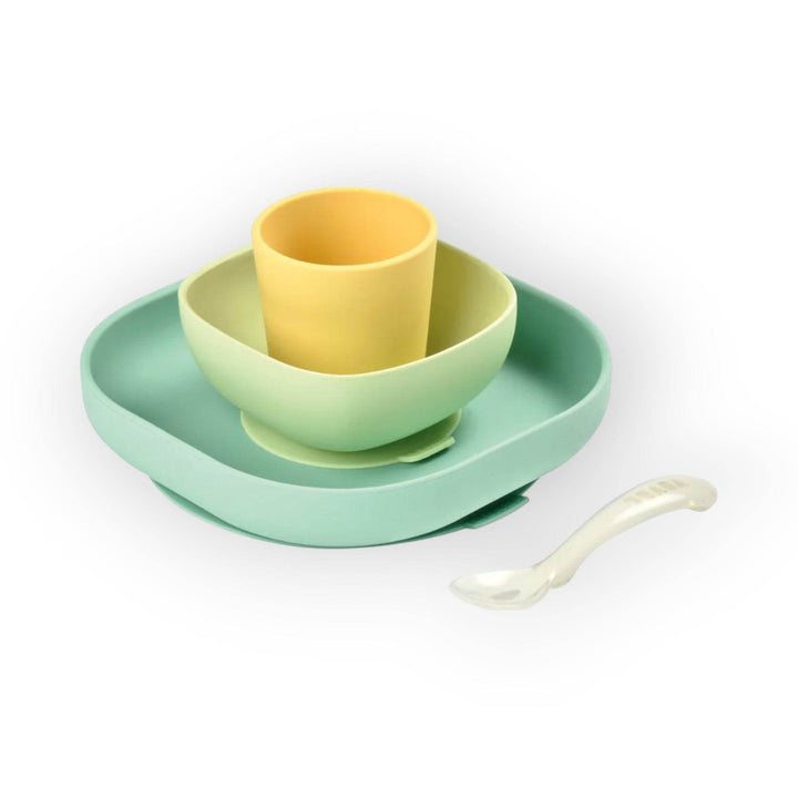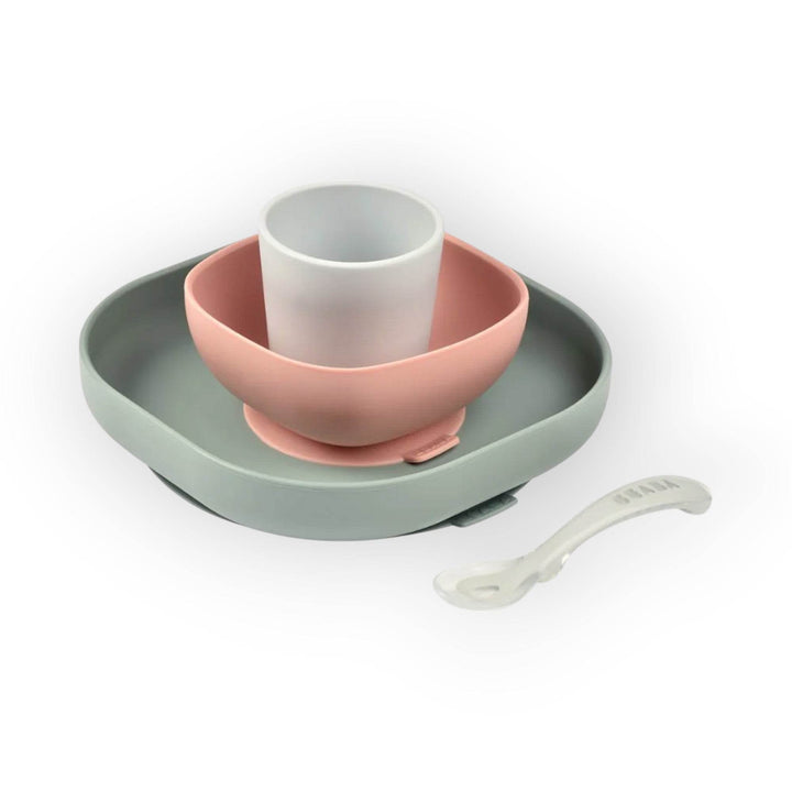 Beaba Silicone meal set consists of a plate and a bowl with suction pad, baby cup and second stage spoon for baby to feed itself.