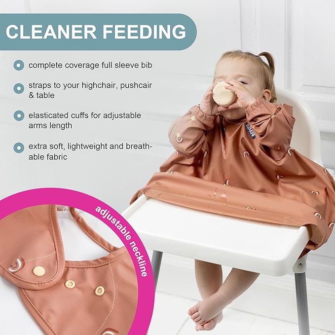Introducing our amazing long sleeve feeding bibs for babies and toddlers by Bibado - the ultimate solution for mess-free mealtimes and worry-free weaning adventures! Tired of those traditional silicone bibs that always lead to messy clothes and endless clean-up? Look no further! Our bibs are designed to fit seamlessly on your highchair, making mealtime a breeze and keeping your little one perfectly clean and dry, even during the messiest meals or craft activities. Whether your highchair is wide, large, or doesn't have a tray, our coveralls work like a charm. Plus, they're incredibly versatile, fitting most strollers and can even be used directly on a table. You can trust us to deliver coveralls that guarantee mess-free meals both on the go and at home. Made from a unique, lightweight, and 100% waterproof material, our easy-wipe coverall weaning bibs are a piece of cake to clean after every messy adventure. Just give them a quick wipe, and they'll be good as new. For a more thorough cleaning, simply toss them in the washing machine at 40 degrees Celsius or 100 degrees Fahrenheit. But hold on, there's more!