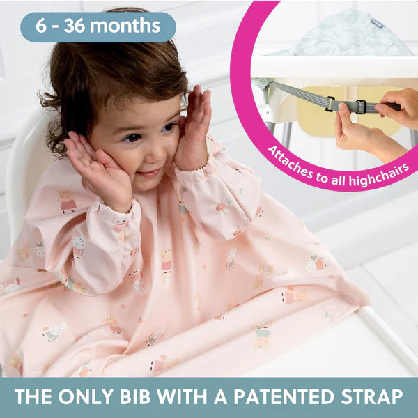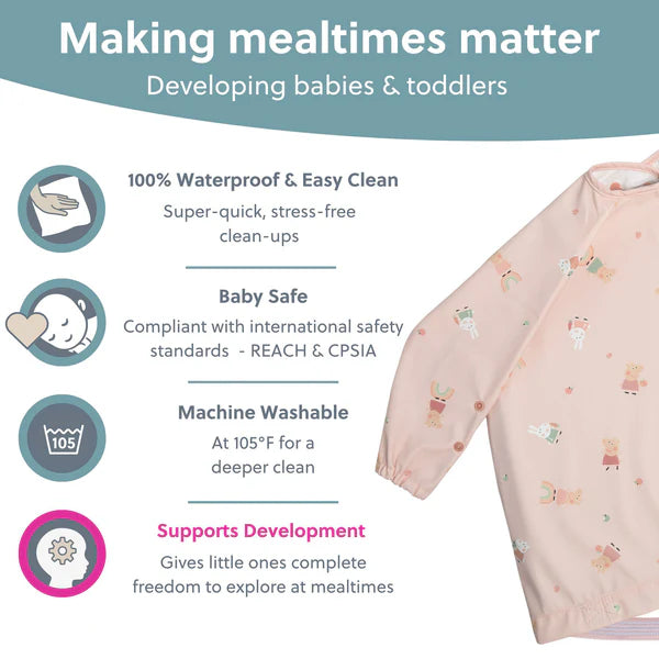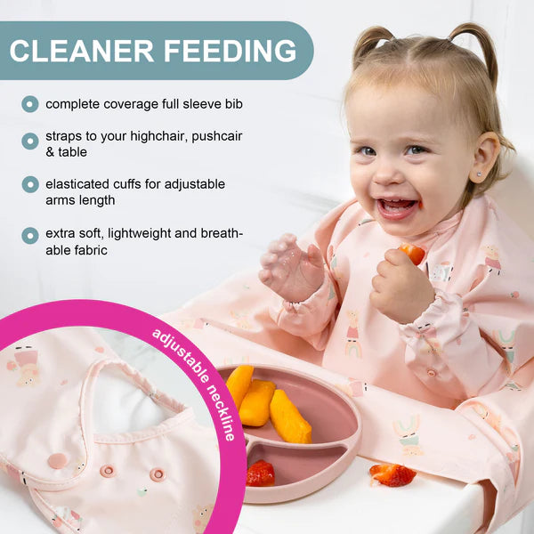 Introducing our amazing long sleeve feeding bibs for babies and toddlers by Bibado - the ultimate solution for mess-free mealtimes and worry-free weaning adventures! Tired of those traditional silicone bibs that always lead to messy clothes and endless clean-up? Look no further! Our bibs are designed to fit seamlessly on your highchair, making mealtime a breeze and keeping your little one perfectly clean and dry, even during the messiest meals or craft activities. Whether your highchair is wide, large, or doesn't have a tray, our coveralls work like a charm. Plus, they're incredibly versatile, fitting most strollers and can even be used directly on a table. You can trust us to deliver coveralls that guarantee mess-free meals both on the go and at home. Made from a unique, lightweight, and 100% waterproof material, our easy-wipe coverall weaning bibs are a piece of cake to clean after every messy adventure. Just give them a quick wipe, and they'll be good as new. For a more thorough cleaning, simply toss them in the washing machine at 40 degrees Celsius or 100 degrees Fahrenheit. But hold on, there's more!