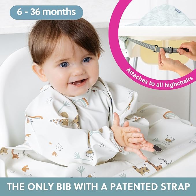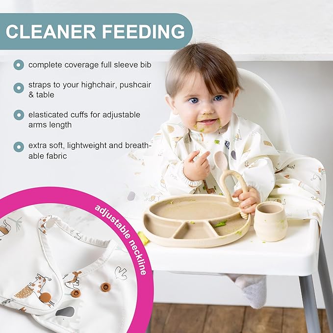 Introducing our amazing long sleeve feeding bibs for babies and toddlers by Bibado - the ultimate solution for mess-free mealtimes and worry-free weaning adventures! Tired of those traditional silicone bibs that always lead to messy clothes and endless clean-up? Look no further! Our bibs are designed to fit seamlessly on your highchair, making mealtime a breeze and keeping your little one perfectly clean and dry, even during the messiest meals or craft activities. Whether your highchair is wide, large, or doesn't have a tray, our coveralls work like a charm. Plus, they're incredibly versatile, fitting most strollers and can even be used directly on a table. You can trust us to deliver coveralls that guarantee mess-free meals both on the go and at home. Made from a unique, lightweight, and 100% waterproof material, our easy-wipe coverall weaning bibs are a piece of cake to clean after every messy adventure. Just give them a quick wipe, and they'll be good as new. For a more thorough cleaning, simply toss them in the washing machine at 40 degrees Celsius or 100 degrees Fahrenheit. But hold on, there's more!
