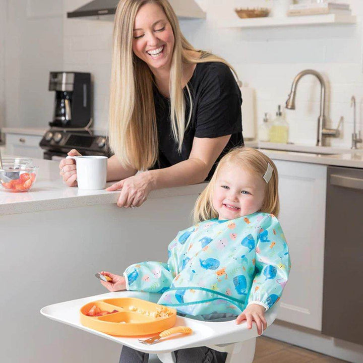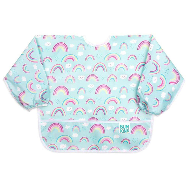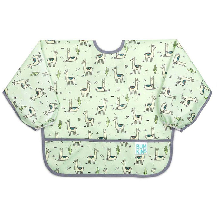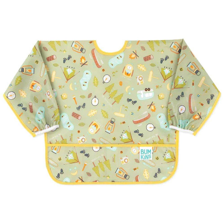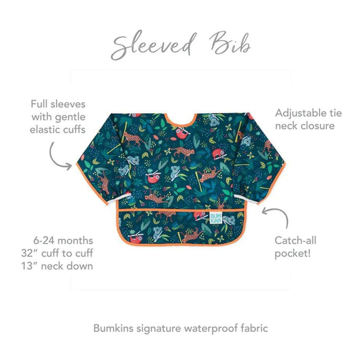 Our Sleeved Bib saves one outfit at a time. With a handy crumb catcher / catch-all pocket for containing spills. Generously sized and made from Bumkins lightweight, waterproof, easy-wipe, stain and odor resistant fabric.?Single ply construction means no worrying about icky stuff growing between layers of fabric. Without a cotton layer, stains and smells don't stick. Adjust the fit with a back-tie closure and adjust sleeve length with elasticized cuffs. Wipeable and machine washable for easy cleaning so you can use it over and over again!