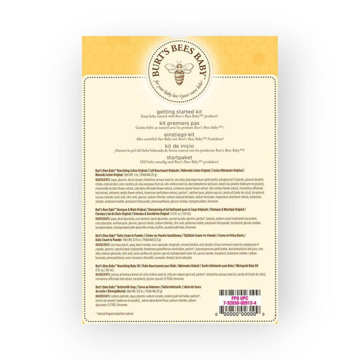 Burt's Bees Baby Getting Started Gift Set, makes a welcome baby gift for a new mom. It has everything a mama needs to gently care for her little one's delicate skin. This 5 piece gift set comes in an attractive box making it the perfect gift for Mother's Day or a baby shower. It includes trial sizes of Burt's Bees Baby Nourishing Lotion, Shampoo & Wash, Cream-to-Powder, Nourishing Baby Oil and Buttermilk Soap. These baby care products are specially formulated with natural ingredients and are gentle enough to use everyday. They are pediatrician-tested and contain no phthalates, parabens, petrolatum or SLS. The convenient sizes make it easy to keep at hands reach or stash in a diaper bag. This set makes the perfect baby shower gift or a gift for a new mom. Keep baby natural with Burt's Bees Baby products from Burt's Bees.