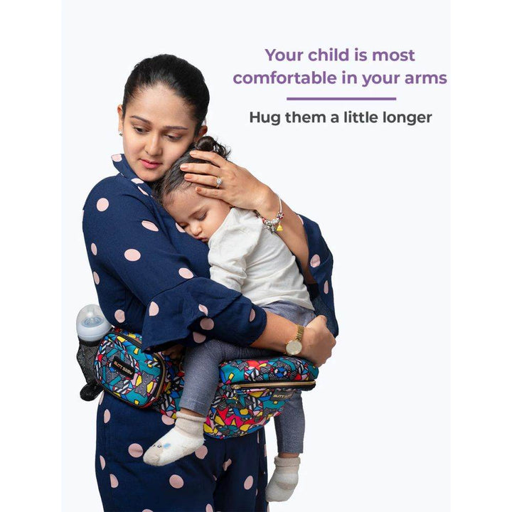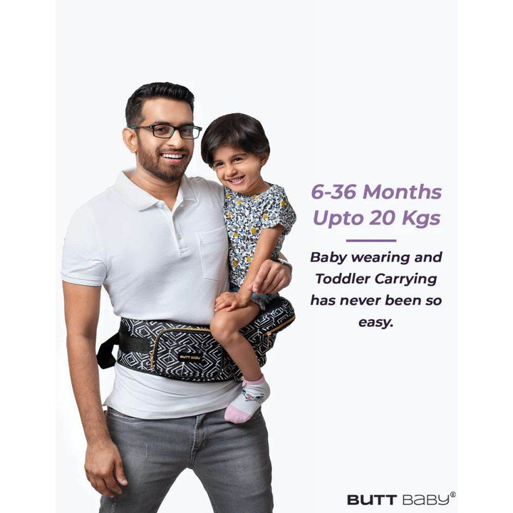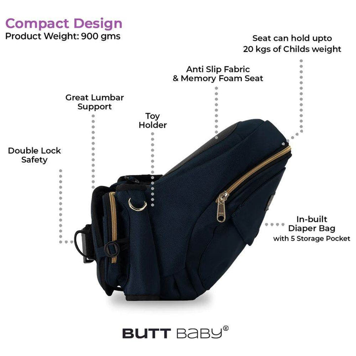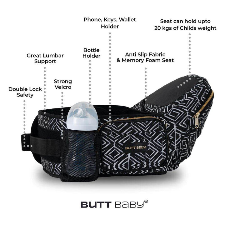 Butt Baby is a seat for your baby. It is a simple baby carrier with just one strap that wraps around your waist and sits above your hips to help you carry your baby more comfortably. This seat is designed to put your baby's hips in the recommended M-shaped position while taking the strain off of your back, arms, and hips. The Butt-Baby offers 6 different carry positions and multiple safety features. It's also designed to store items like diapers, wipes, and other essentials inside. While not in use the Butt Baby-Seat can be folded into a sling and be carried around with ease. The Butt Baby-Seat also has a foldable shopping bag inside, stash in stuff and go hands free!