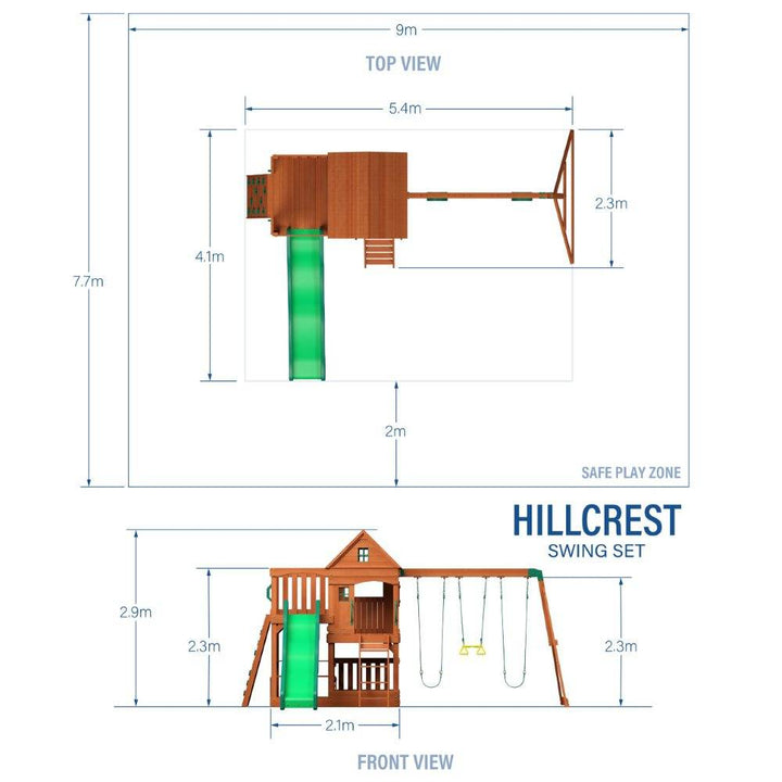 It’s easy to picture the scenes from the California coastline while playing on the Hillcrest. The large upper fort comprises a quaint barn-styled clubhouse and balcony, while the two-level lower deck will have you feel like taking a jaunt down Venice beach with its half picnic table and sand box area. Use the ladder or rock wall to climb your way up, and the 10’ slide to zip back down. You’ll soar into even better views when you jump onto either the two belt swing or a trapeze. The Hillcrest is surely a sight to see, and it can be found right in your own backyard