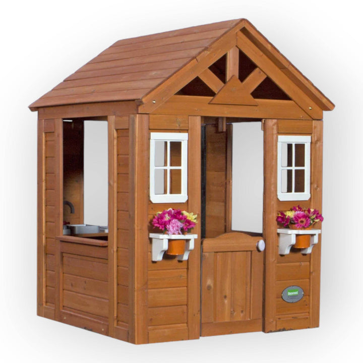 The Timberlake Playhouse is a great playhouse that the whole gang will love. It has wide windows that sunny breezes can blow through. The front is adorned with flower pot holders and a cute half-door.