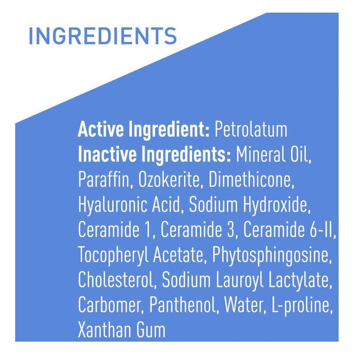Inactive ingredients: Mineral Oil, Paraffin, Ozokerite, Dimethicone, Hyaluronic Acid, Sodium Hydroxide, Ceramide 1, Ceramide 3, Ceramide 6-ii, Tocopheryl Acetate, Phytosphingosine, Cholesterol, Sodium Lauroyl Lactylate, Carbomer, Panthenol, Water, L-Proline, Xanthan Gum