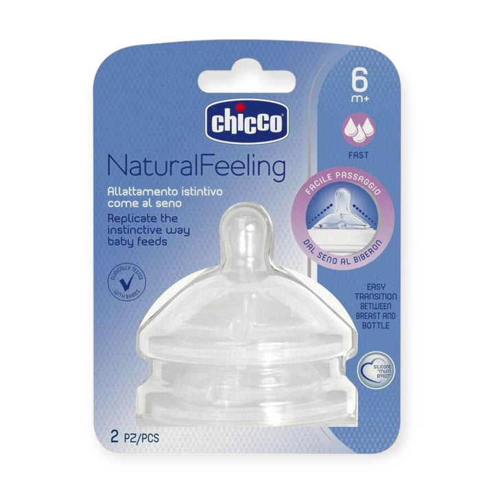 Chicco's NaturalFeeling teats allows to replicate the natural and instinctive attachment to the mother's breast. The Exclusive teat with rounded base supports comfortable position and natural latch for growing babies. The Chicco NaturalFeeling Fast Flow Teat is ideal to feed babies at 6M+. Thanks to the double anti-colic valve at the base of the teat, the Natural Feeling 6M + fast Flow teat helps prevent the ingestion of air during sucking, the main cause of colic and ensures continuous milk flow thereby reducing the risk of colic after feeding