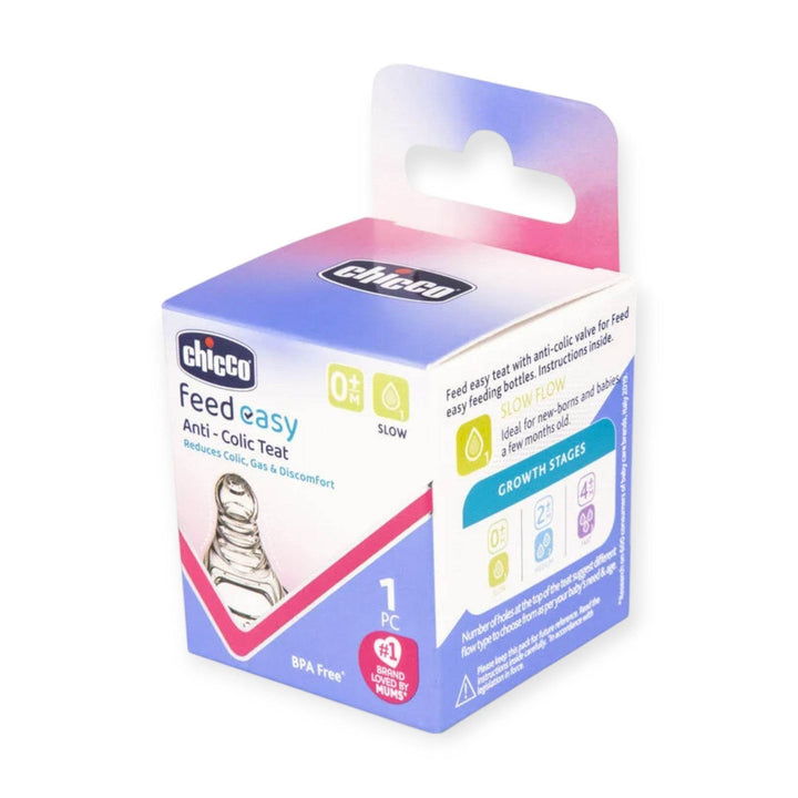 Chicco Feed-Easy Teat has been designed in collaboration with Chicco Research Center to provide an easy and comfortable feeding experience for babies. Chicco Feed Easy Teat comes with an anti-colic valve that gets ventilated as the baby starts to suckle preventing any vaccum build-up by keeping air at the back of the bottle. This helps prevent air ingestion by the baby and ensures uninterrupted feeding; thus reduces colic, gas & discomfort in babies. Feed Easy Nipple has a spiral-grooved texture helps to minimize air bubbles as milk passes through it, resulting in air-free feeding and no nipple collapse.