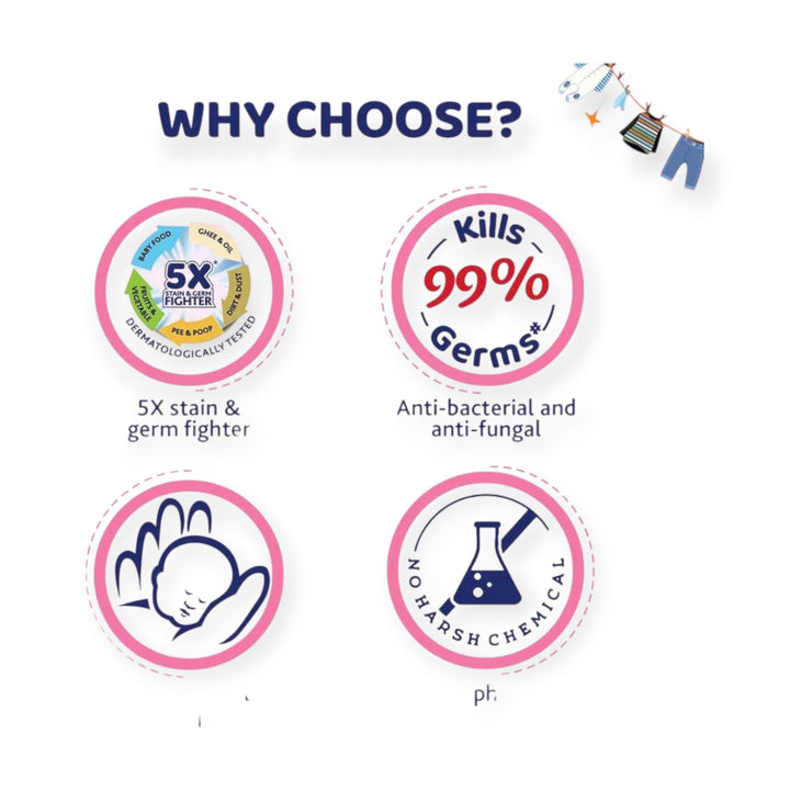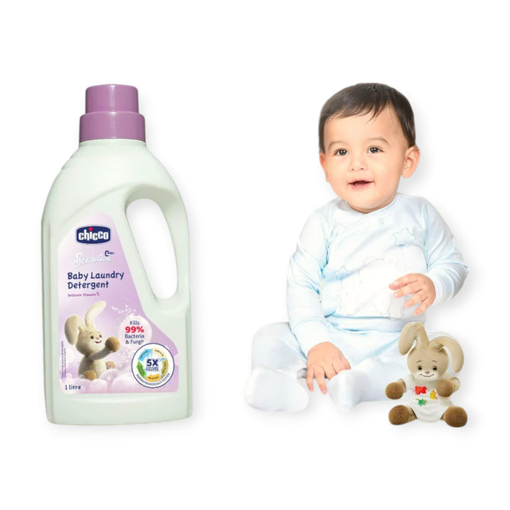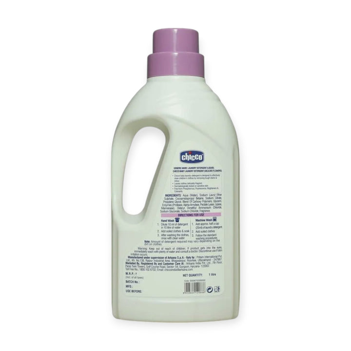 Chicco Baby Laundry Detergent is specially designed to remove germs and tough stains along with the odour. It aims to leave the clothes delicately fragrant without any additive fragrances. It is manufactured with five special enzymes, which are effectively against almost all types of stains and germs that the baby’s clothes are prone to get such as baby food, ghee-oil, fruits-vegetables, dirt-dust, or even pee-poop. The Chicco baby laundry detergent gives your little one’s clothes a complete hygienic wash with antibacterial and antifungal properties, killing 99% of the germs present on the clothes. It is dermatologically tested and found to be 100% safe on the baby's tender skin. It is free from phosphorus, fluorescence, brighteners & colorants, keeping the clothes gentle and delicate on the baby's skin.
