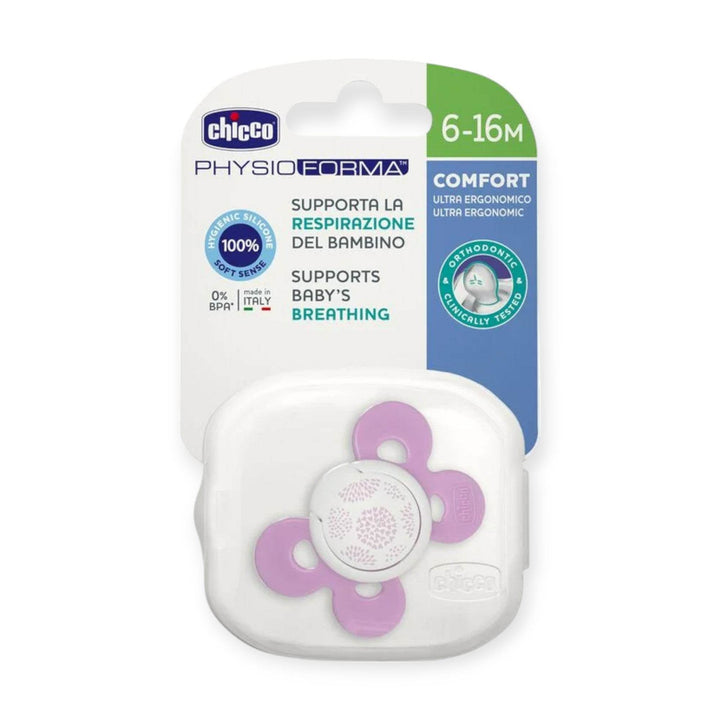 The Chicco PhysioForma Comfort 6-16m silicone pacifier has an exclusive shape. It favours the correct development of the baby's mouth and helps to position the tongue forward, to create an open airway, thus supporting physiological breathing. The PhysioForma comfort soother has an ergonomic shape with only 4 points of contact for an extreme gentleness on the baby's face. Chicco PhysioForma Comfort 6-16m is made of silicone, a material chosen for practicality, hygienic and non-deformable features. The exclusive SOFT SENSE finish makes it soft and velvety.