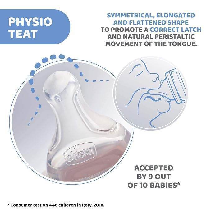 The Chicco Physio teat adapts perfectly to the baby's mouth and respects the natural sucking movement. Made of extra soft silicone, the Physio Chicco teat perfectly simulates the mother's breast, offering the baby a comfortable feeling that facilitates acceptance.