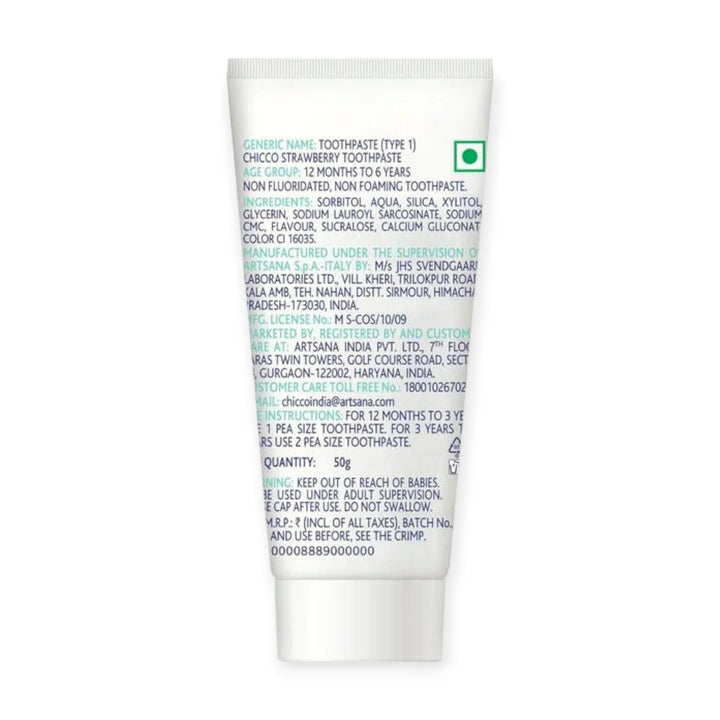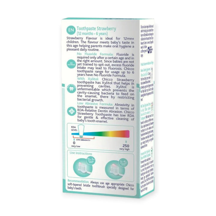 Fluoride - free - Excessive consumption of fluoride intake may lead to fluorosis, hence chicco kids toothpaste contains no fluoride for babies upto 6 years of age