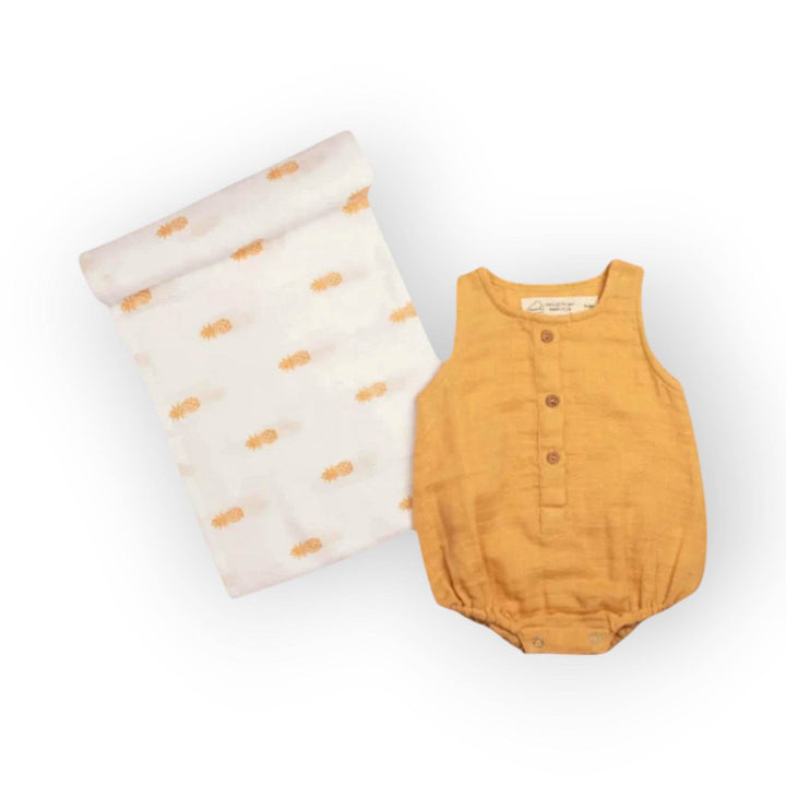 """It's a classic for a reason. One of our organic swaddle blankets gets perfectly paired with a cutest-of-cute, baby romper.