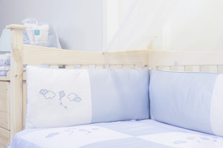 At Blooms and Butterflies, coziness is our design philosophy. Our Cloudy Blue four piece Bumper Cover Set is made from 100% soft, breathable cotton material, providing a perfectly comfortable surface for your baby. Designed to fit most cots; secure the ties to the four sides of the cot and regularly check that they are tied in place for babys safety.