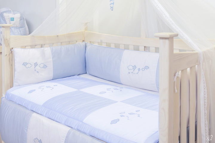 Our Cloudy Blue Comforter provides an additional layer of comfort to the cot bedding and cosiness to the nursery. Made with 100% cotton fabric, it is soft, breathable, and perfect for your little ones delicate skin. The inner padding provides natural warmth and keeps the babys body temperature in its normal range. All materials used are clean, eco-friendly, and without any additional chemical treatments.