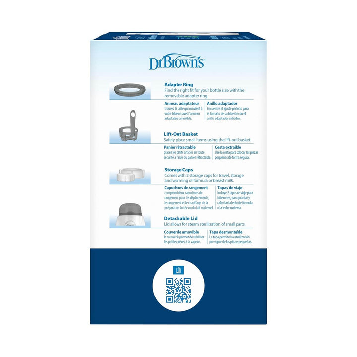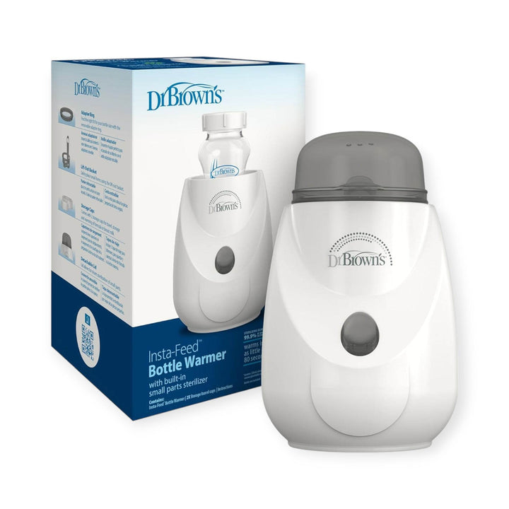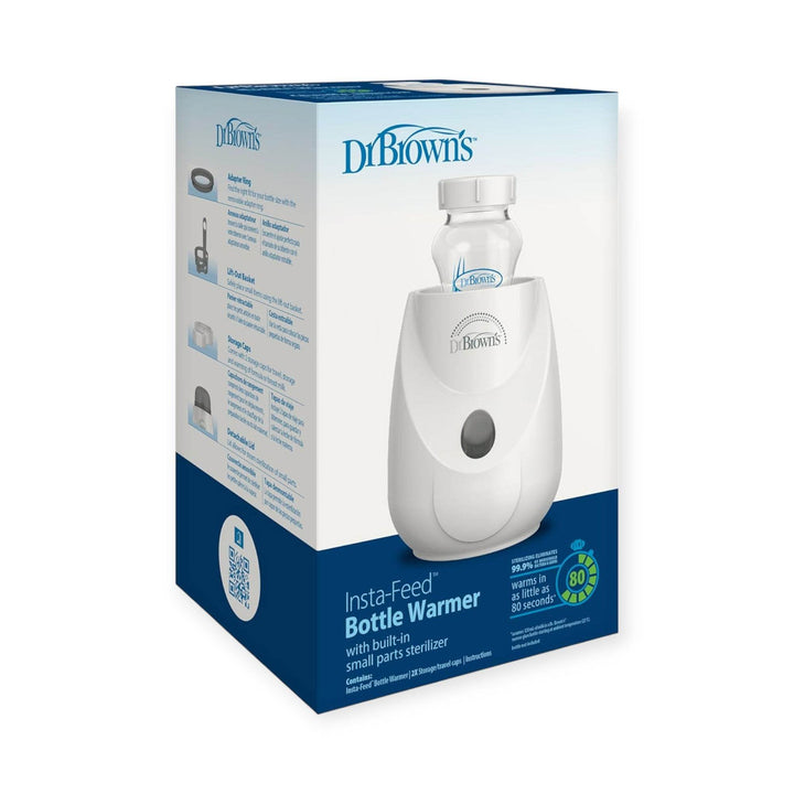 Warming baby bottles and food jars just got easier! In as little as 80 seconds with just the press of a button, you can have warm breast milk, formula, or purees ready to go with Dr. Brown's Insta-Feed Baby Bottle Warmer and Sterilizer. Gentle steam heat is used to evenly warm contents, ensuring your baby's meal is just the right temperature. Plus, this 2-in-1 baby essential pulls double duty by sterilizing small parts like nipples and pacifiers. Its compact size helps minimize countertop clutter, and the lift-out basket makes it easy to remove smaller items and keep your hands safe. Make feeding time easier with Insta-Feed! Warranty valid in the US and Canada only.