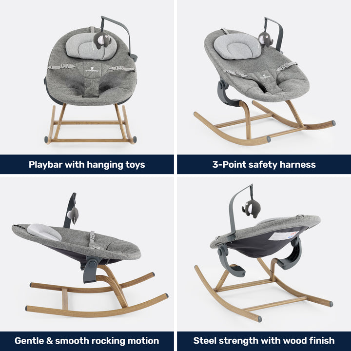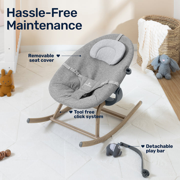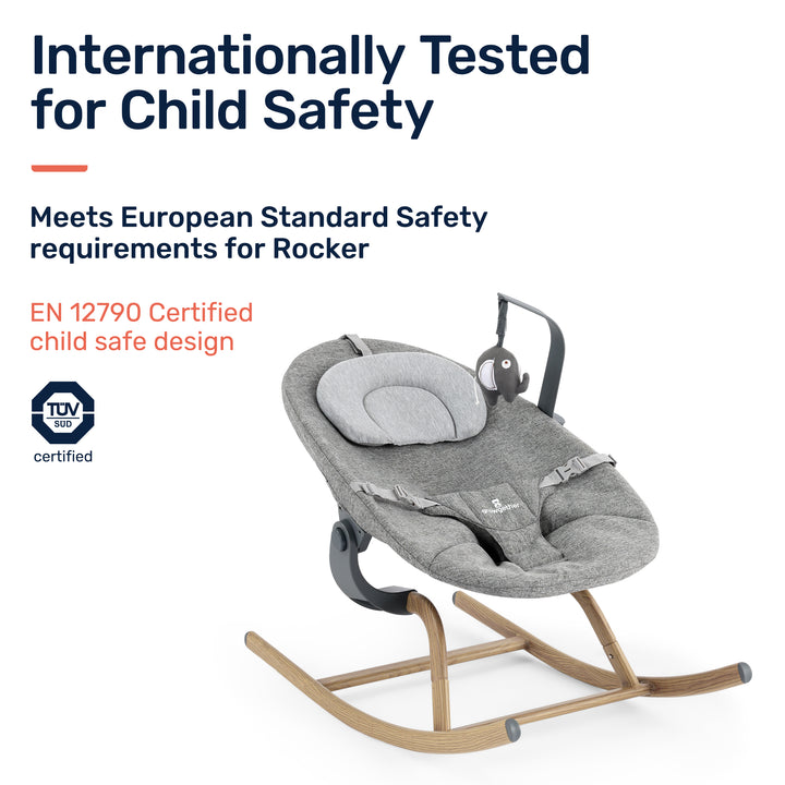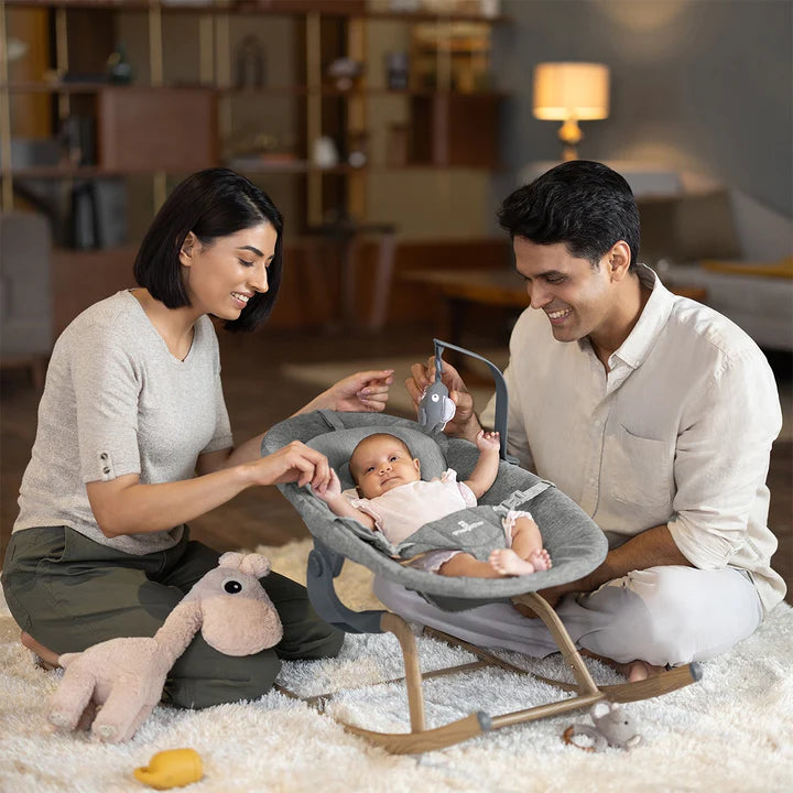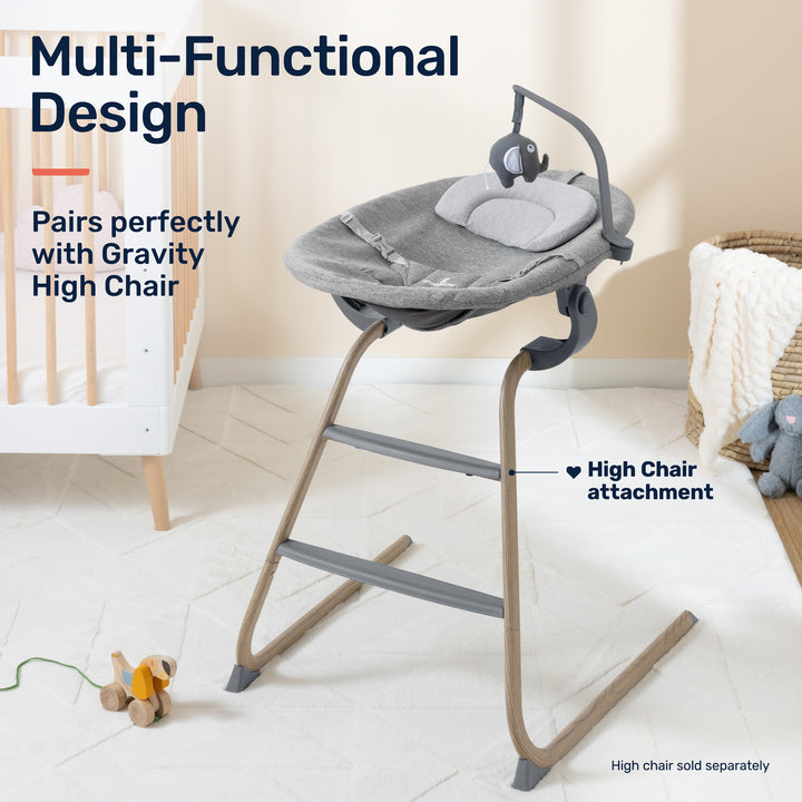 Gentle Comfort, Effortless Ease. A gentle sway, a secure haven, and a design that understands the rhythm of modern parenting. The Growgether Baby Rocker brings together comfort and calm in a thoughtfully designed package that complements your style. With its ergonomic support, premium materials, and three adjustable recline settings, it seamlessly adapts to your little one’s needs whether they’re curiously observing, peacefully dozing, or needing a moment of gentle calm. Its clever compatibility with the Gravity High Chair offers a welcome hands-free solution for busy moments