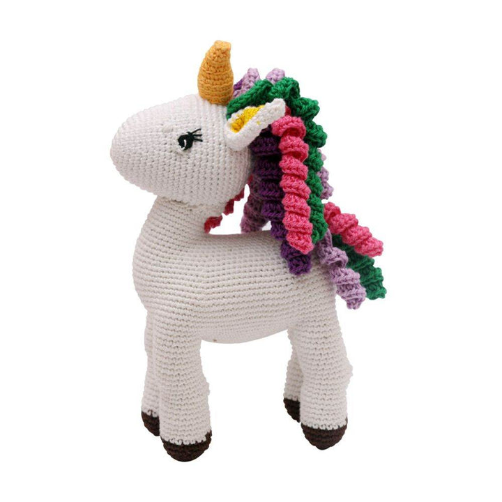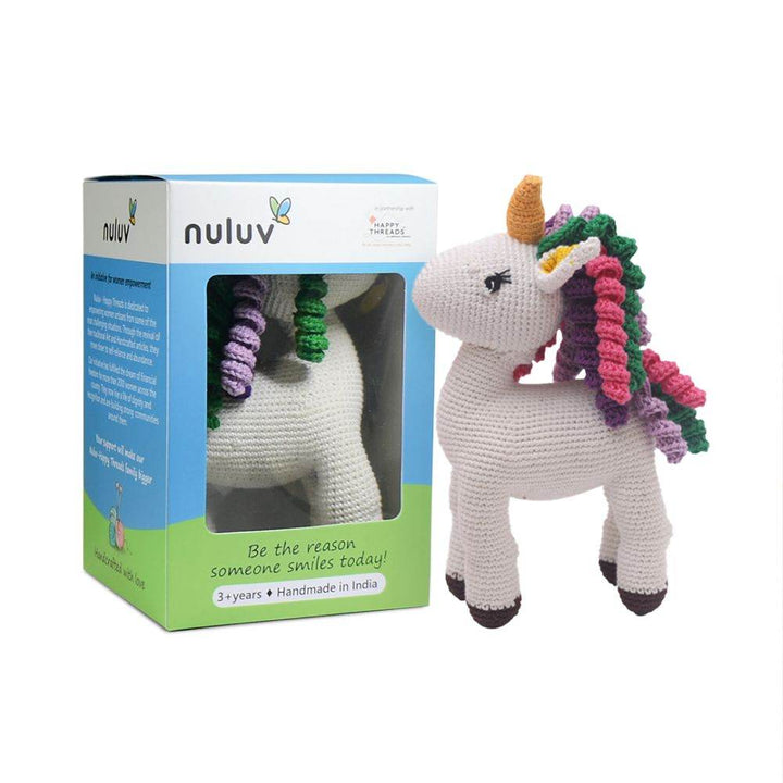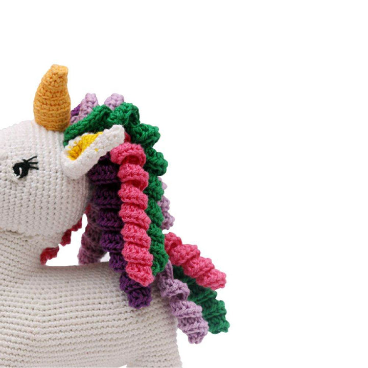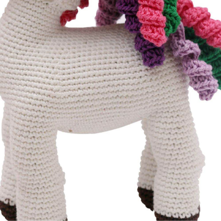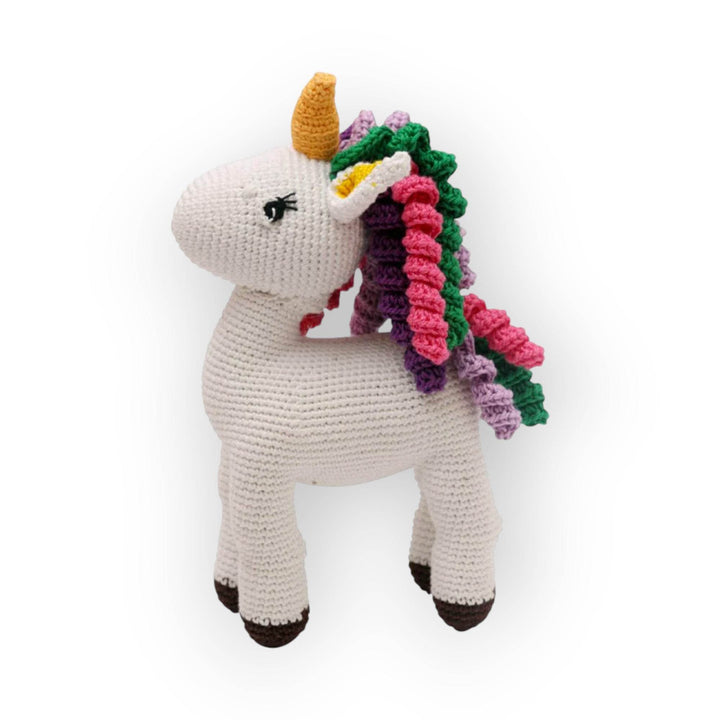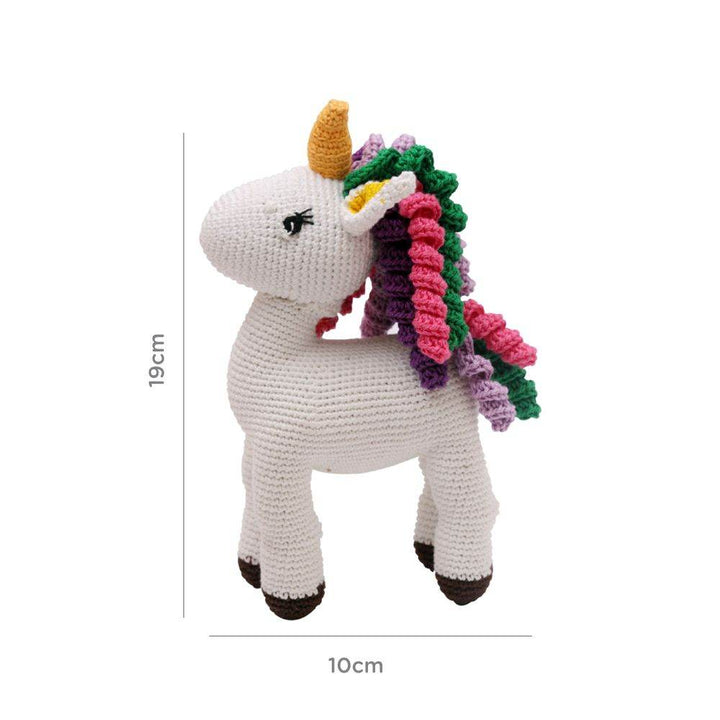 Crochet Hand-Made Unicorn Soft Toy. Made from high-quality Cotton Yarn. Recommended and Safe for Children 2 yrs aboe . 100% Washable and Hygienic. It's color and attracts kids so much that they love it. Your child will learn more about the animal and can engage in different activities with the toy as well. Ideal gifting items.