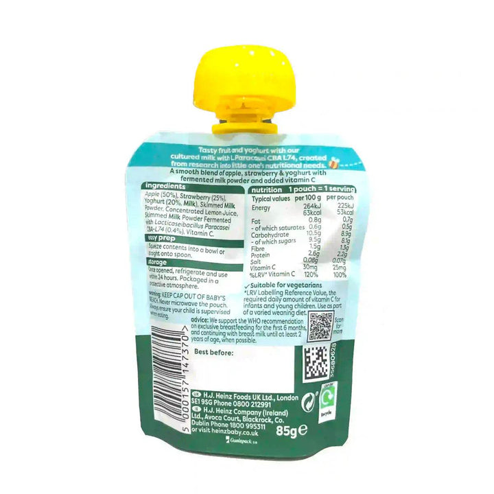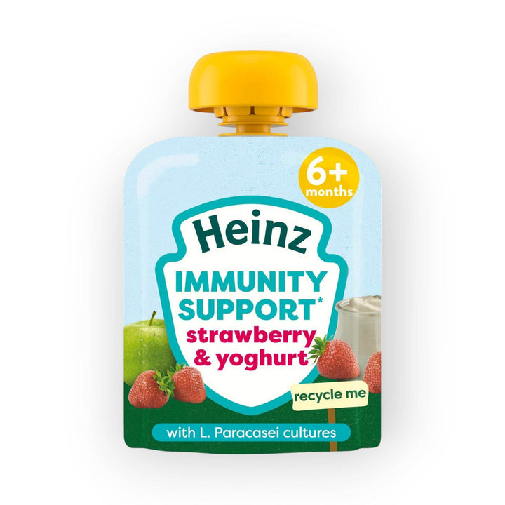 Start your baby’s weaning journey in a healthy, balanced way with Heinz Immunity Support Pouches Baby Food. Suitable for little ones aged 6 or 7+ months, these delicious fruity snacks include L. Parabascei cultures & Vitamin C to support the immune system. Immunity support* *Contains vitamin C which contributes to the normal function of the immune system. Tasty fruit and yoghurt with our cultured milk with L.Paracasei CBA L74, created from research into little one's nutritional needs. With L. paracasei cultures, Suitable for vegetarians. A smooth blend of apple, strawberry and yoghurt with fermented milk powder and added vitamin C.