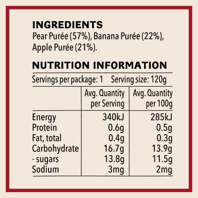 Pear Purée (57%), Banana Purée (22%), Apple Purée (21%).