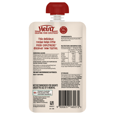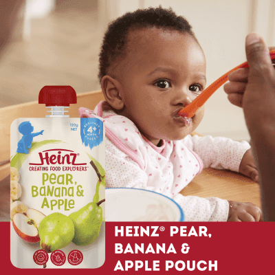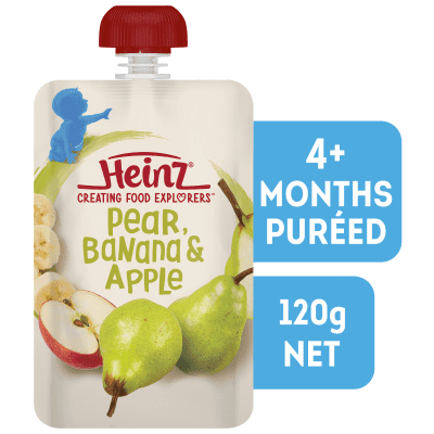 Heinz® Pear, Banana & Apple helps little Food Explorers® discover new tastes. For beginners 4+ months, this is a great snack for home and is easy to take on-the-go too. Simply squeeze onto a spoon to serve, or to serve warm, place pouch in a bowl of hot water until warm.