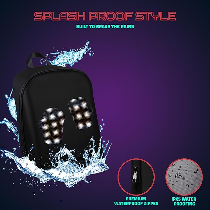 Water resistant-IPX5| LED screen Resolution-64*64 pixels| Laptop Sleeve-Can carry 14 inches Laptop| Waterproof Zipper| Usage-Daily, Outdoor, Travel, School, Corporate, Outdoor Sport, Cycling, Biking, Parties| Bag Size-17 inches bag|| H-43cm, W-30 cm, D-13 cm| Bag Capacity-17 Ltrs.