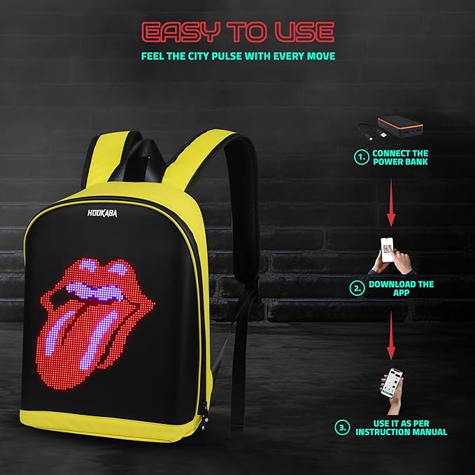 Water resistant-IPX5| LED screen Resolution-64*64 pixels| Laptop Sleeve-Can carry 14 inches Laptop| Waterproof Zipper| Usage-Daily, Outdoor, Travel, School, Corporate, Outdoor Sport, Cycling, Biking, Parties| Bag Size-17 inches bag|| H-43cm, W-30 cm, D-13 cm| Bag Capacity-17 Ltrs.
