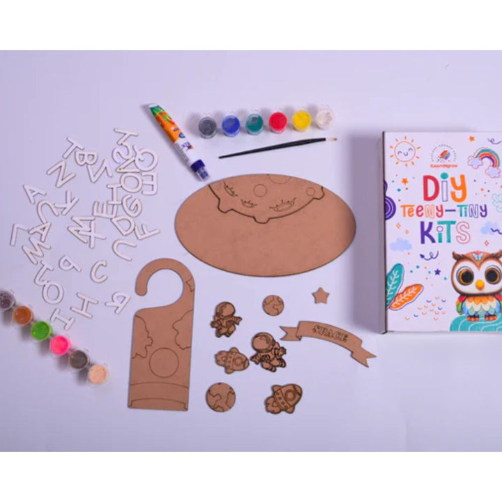The iLearnNGrow Teeny Tiny Space Theme Name Plate and Door Knob Kit is the perfect creative project for little space explorers. This DIY set includes a name plate and door knob hanger with fun space-themed shapes—rockets, stars, and planets—ready to be decorated. With a set of 6 vibrant paint colors, sparkly glitter, colorful pom poms, and Fevicol glue included, kids can design their own intergalactic masterpiece.