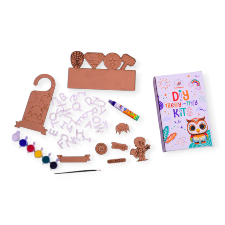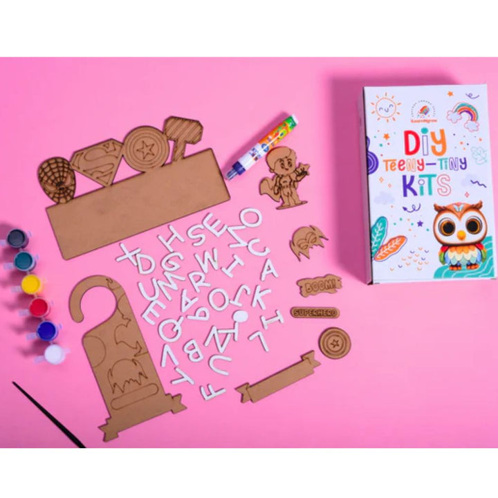 The iLearnNGrow Teeny Tiny Superhero Theme Name Plate and Door Knob Kit is the ultimate creative activity for little superheroes-in-training. This engaging DIY set features a superhero-themed name plate and door knob hanger, perfect for decorating with a burst of color and imagination.