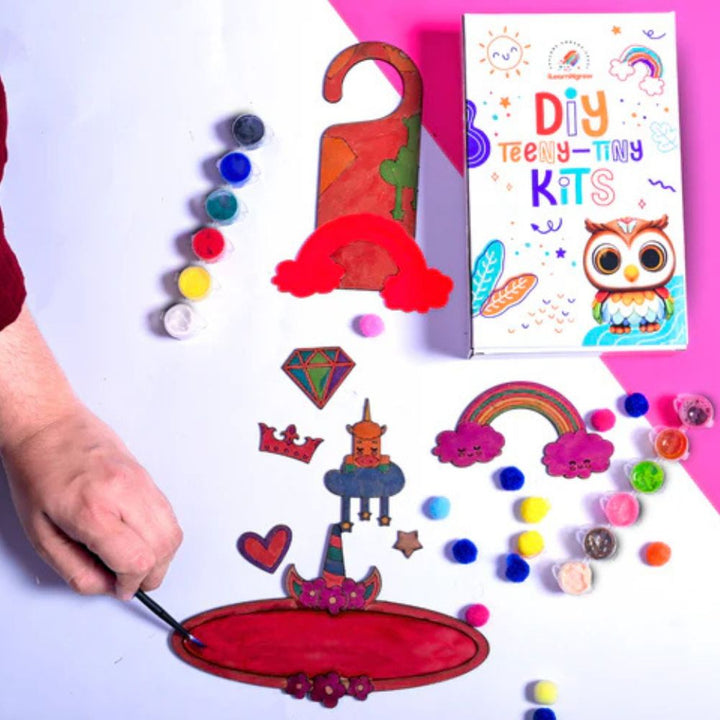 The kit comes fully equipped with a set of 6 vibrant, non-toxic paints, sparkling glitter, soft pom poms, and Fevicol glue—making it easy and safe for kids to create their own magical décor. Ideal for birthdays, weekend projects, or creative playtime, this craft set not only enhances fine motor skills and color recognition but also gives children a chance to express their personality right on their bedroom door!