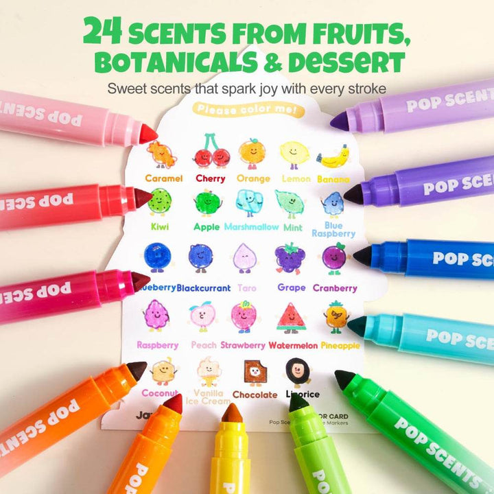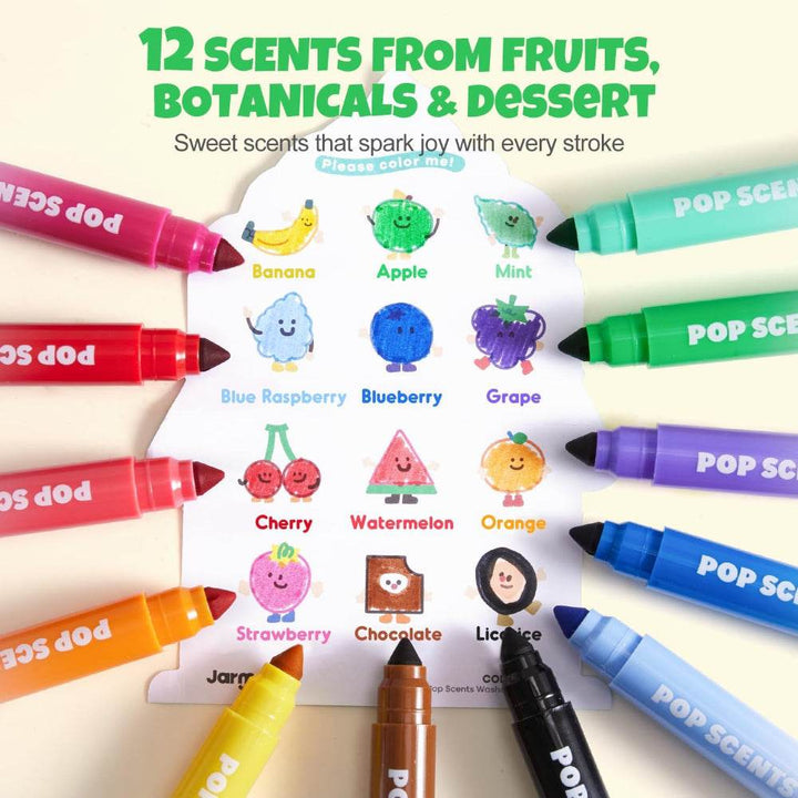Jar Melo Pop Scents Washable Markers, Scented Markers with Scented Coloring Cards, Non-Toxic and Washable Markers for Kids, Natural Fruit, Candy, and Plant Scents.