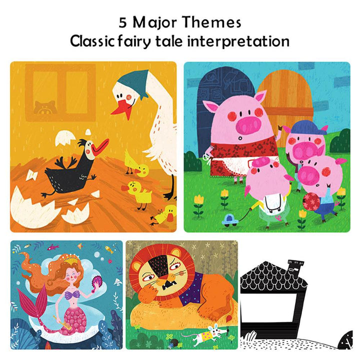 This Jar Melo Shadow Theater-Fairy Tale Delightful set comes with a flashlight projector, 4 story discs, 1 shadow puppet disc, picture storybook and 11 shadow puppets all packed in a beautiful box case.