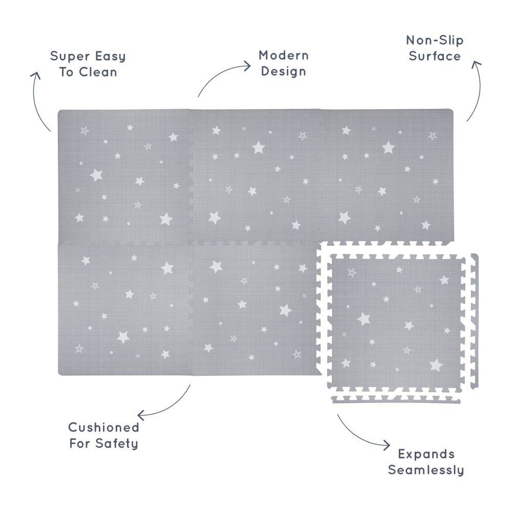 Our modern neutral designs blend seamlessly with your existing decor, while providing a safe haven for little ones during playtime.These mats are thick and shock absorbent with soft cushioning which protects the baby from bruises. It's easy to clean, water resistant, and makes play time comfortable, fun and convenient. The surface is skid-proof, which is great for whacky babies that love to slip, slide, and roll. A safe place to huddle, play, paint and crawl.