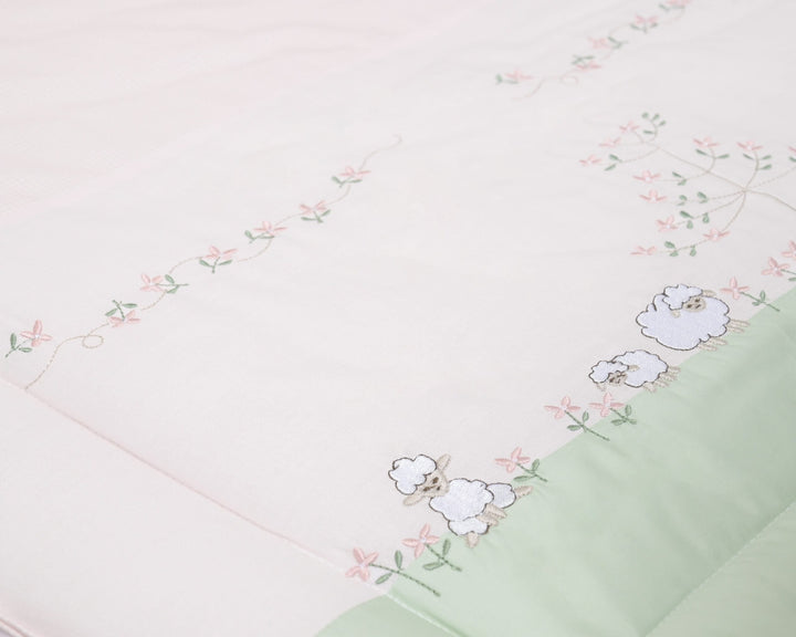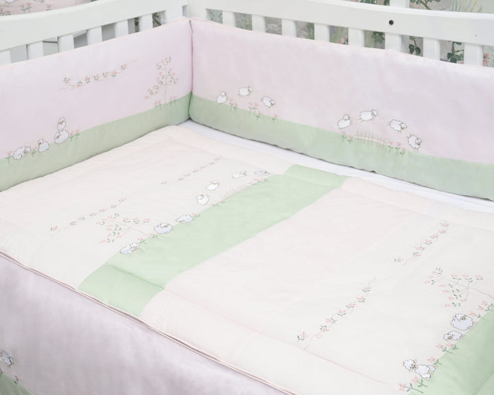 Our Lambs in Meadow Comforter provides an additional layer of comfort to the cot bedding and cosiness to the nursery. Made with 100% cotton fabric, it is soft, breathable, and perfect for your little ones delicate skin. The inner padding provides natural warmth and keeps the babys body temperature in its normal range. All materials used are clean, eco-friendly, and without any additional chemical treatments.