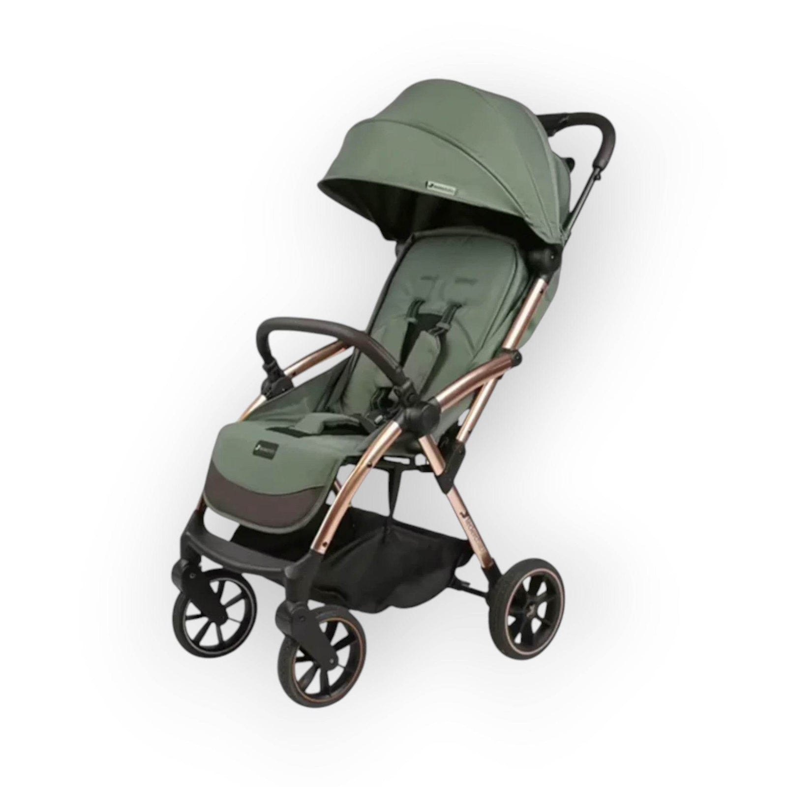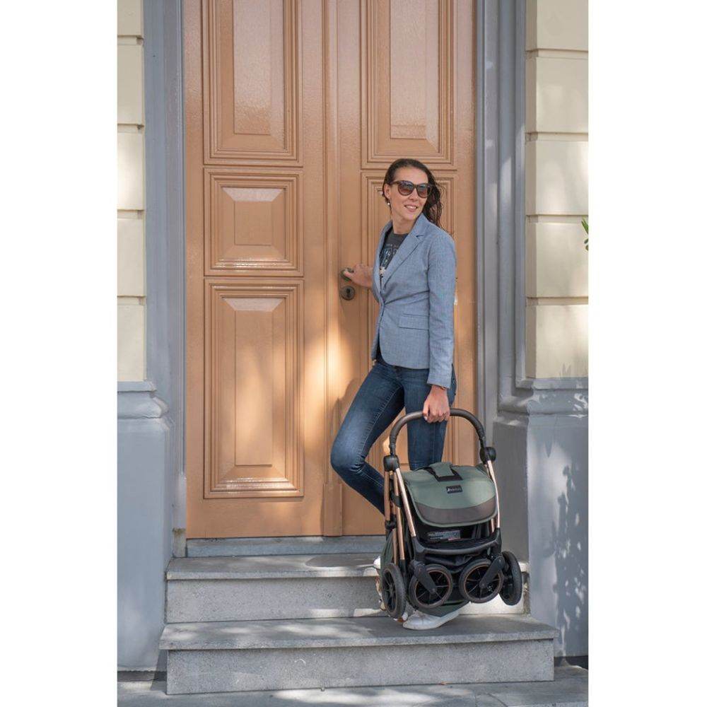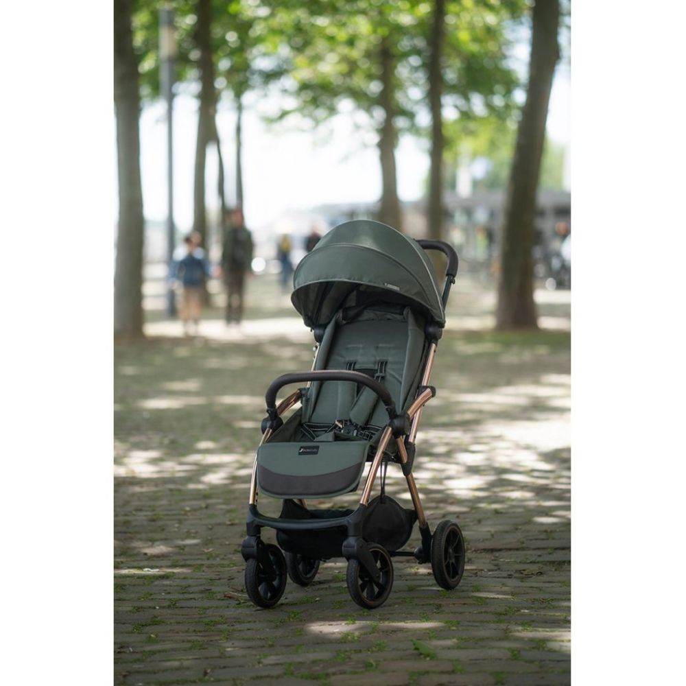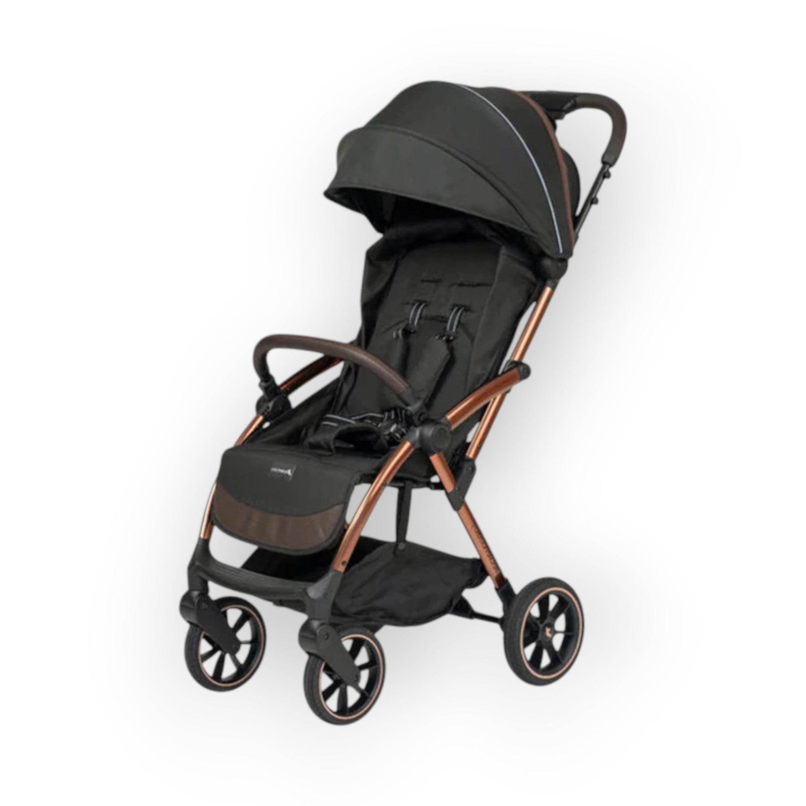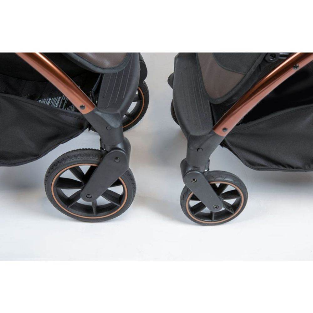 The stroller has larger wheels, allowing you to take your child on terrain and explore the outdoors. Because of its larger wheels, more space in the base, and unique folding