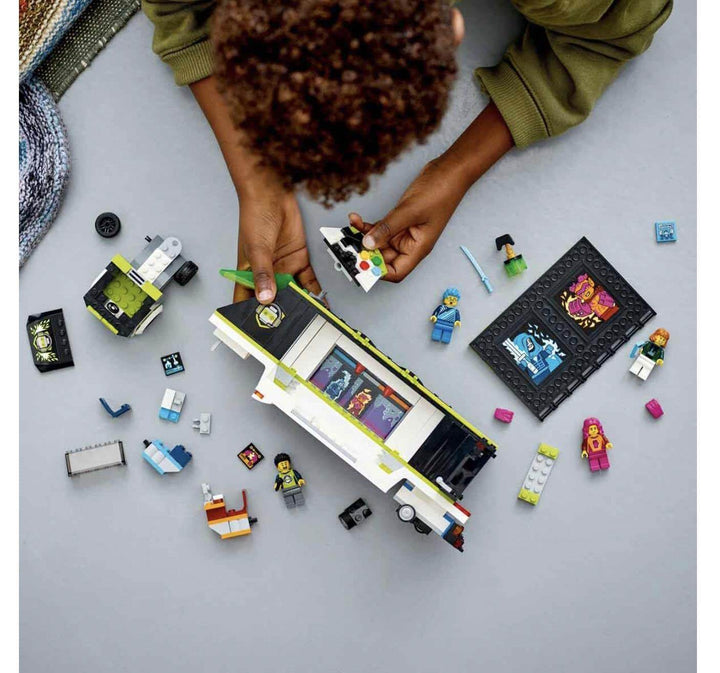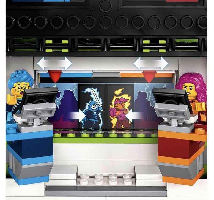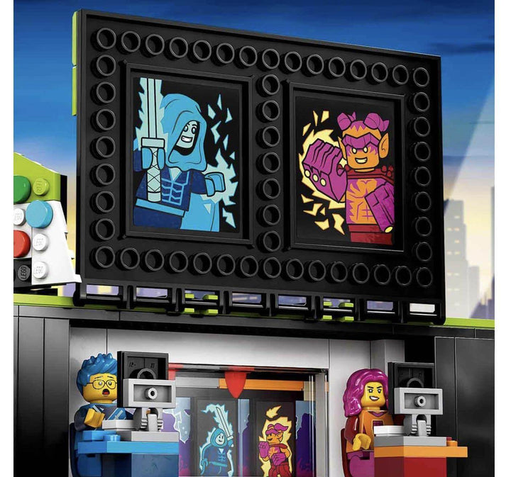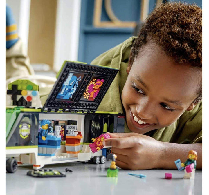 What's in the box? – Everything kids need to create a Gaming Tournament Truck with a stage, 2 toy computer gaming stations and stadium screen, plus a winner’s trophy, merchandise and 3 minifigures