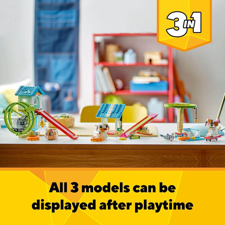 Boys, girls and pet-lovers aged 8+ can play out fun-filled stories with this cute 3in1 Hamster Wheel (31155) animal toy set. It features an interactive playhouse where 1 hamster can run around a spinning wheel and another can zoom down a slide. This hamster playground is also packed with cool accessories including a water tank, a tire, a hanging bell and a food bowl. This LEGO Creator set gives kids 3 different small animal toys to build using the same bricks. They can build a hamster toy playhouse, rebuild it into a play area for a cat with a spinning wheel and a skateboard or a doghouse where a dog can slide down a ramp and play with cool toys. Creator 3in1 sets make exciting LEGO gifts for kids with 3 different models to create in every box. Kids will be excited to build, rebuild and build again. 3in1 sets keep them happy for countless hours and offer a range of models that appeal to their biggest passions, including superfast vehicles, amazing animals and detailed city scenes.